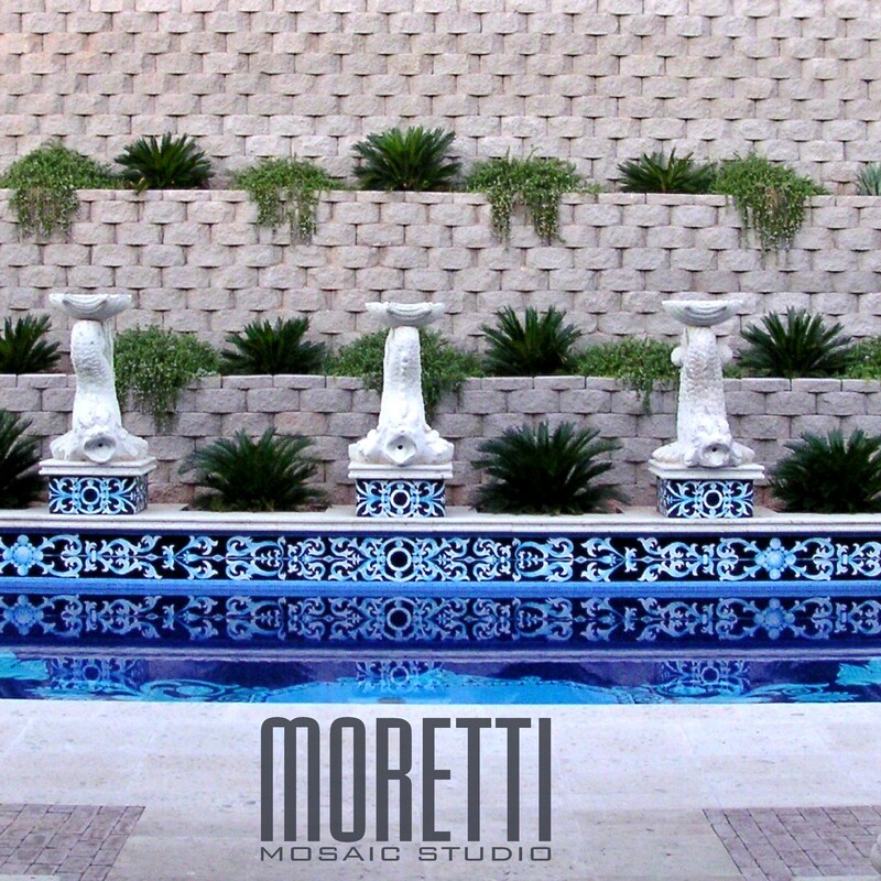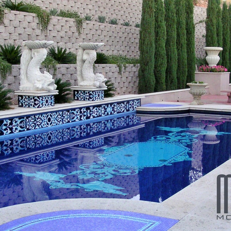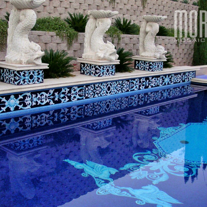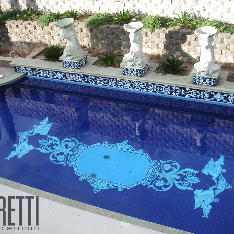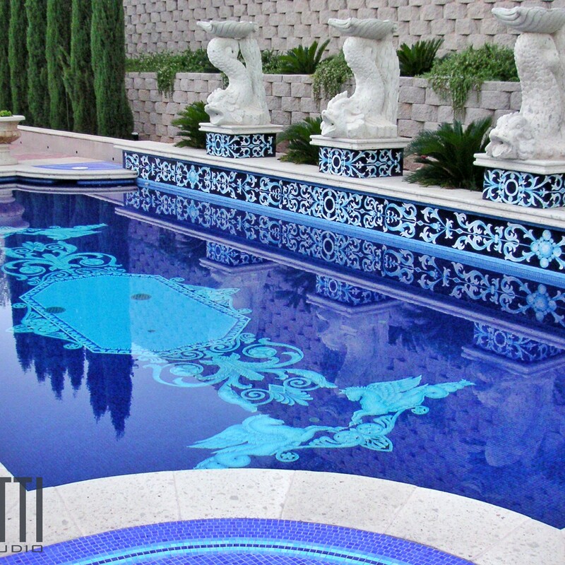 All glass tile pool with custom handmade Rug and Water line.