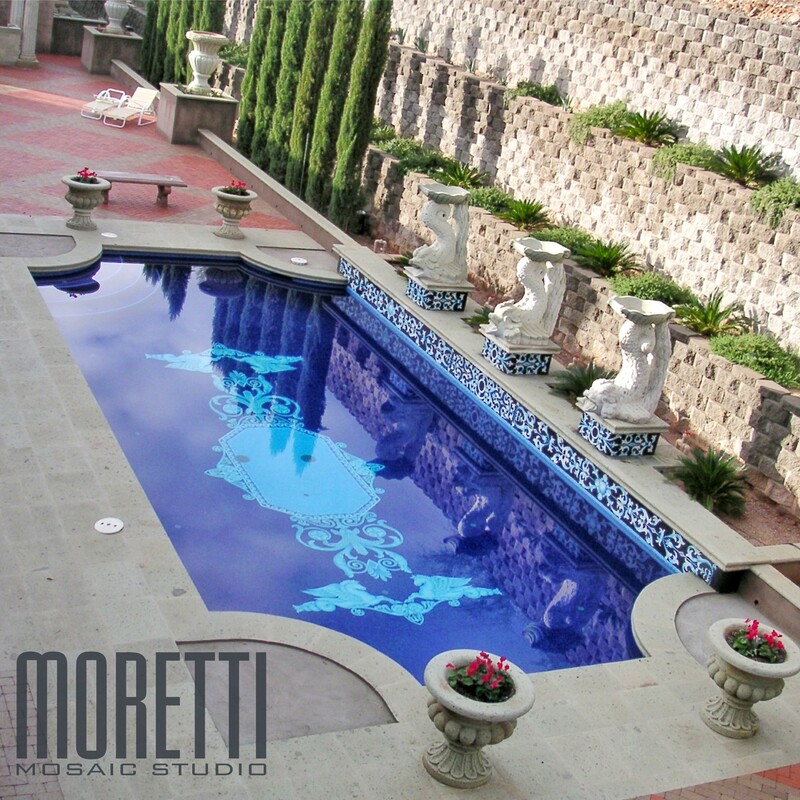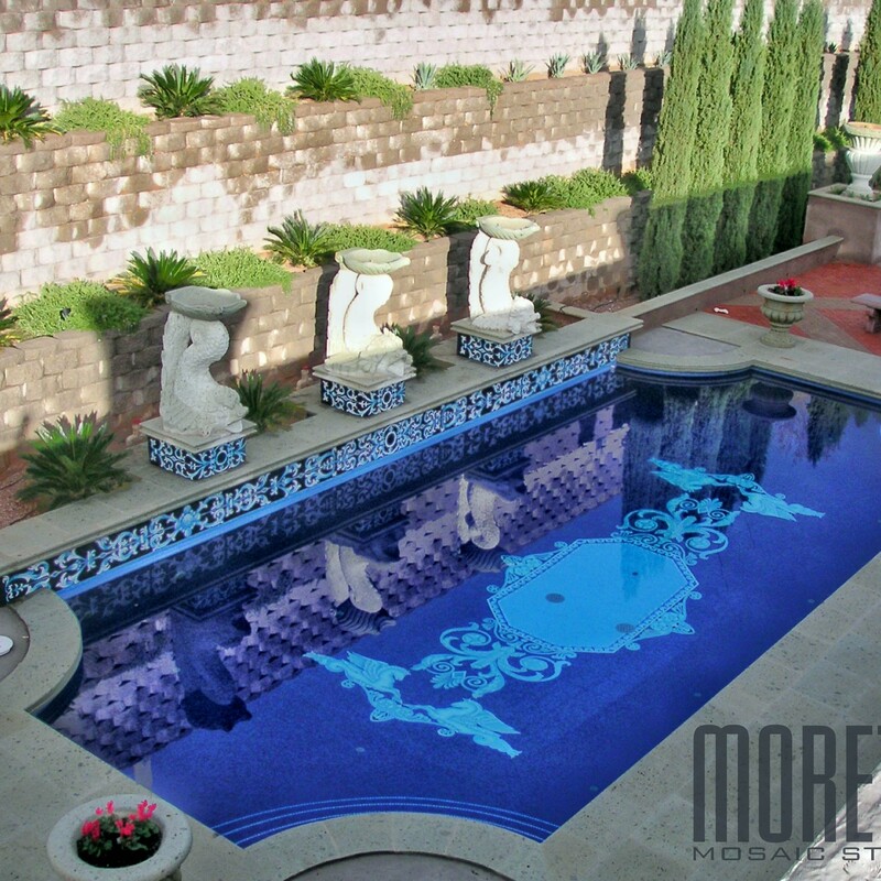 All glass tile pool with custom handmade Rug and Water line.